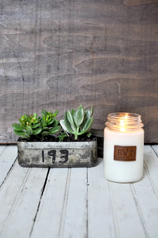 One of the best things about vintage finds and antiques is finding new ways to showcase them in your home or office. Today we wanted to share with you just one of the ways we re-purposed the WWI Bacon Cans found in the RVT Shop. For this terrarium tutorial you will need about ten minutes and a few supplies.