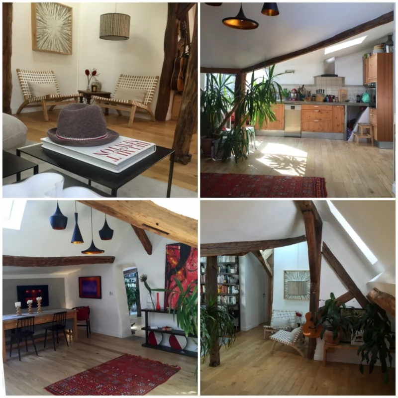 The rest of the apartment was total Modern Vintage with quirky angles, rustic beams, plaster walls, modern light fixtures, comfy couches, and air conditioning. We were thankful we'd put AC on our "must" list since Paris was experiencing a heat wave and it got up to 100 degrees a few days we were there.